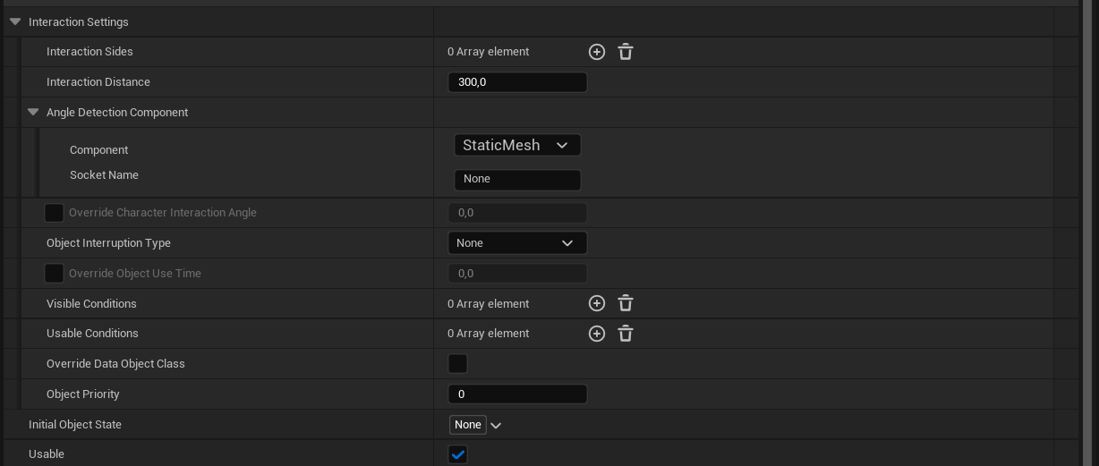 OverrideCharacterInteractionAngle: In case you need to use some custom interaction angle for the object, you can override it using this parameter.