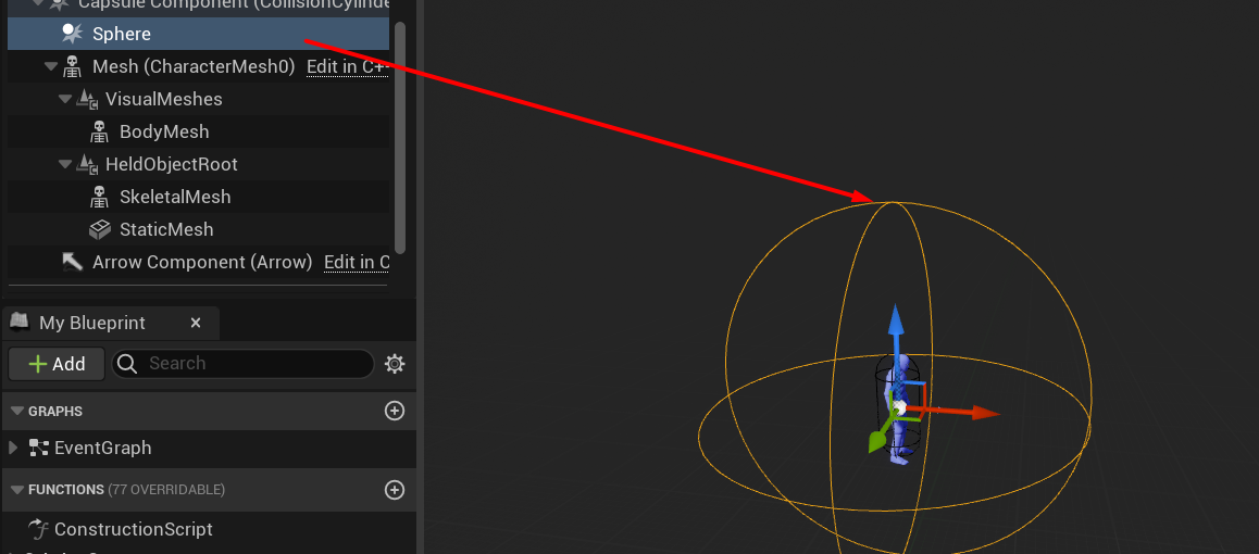 The next step is to add a sphere or any other shape to your character. This sphere will be responsible for overlaps and subsequent processing of your interactive objects. Set the collision settings based on the requirements of your project.