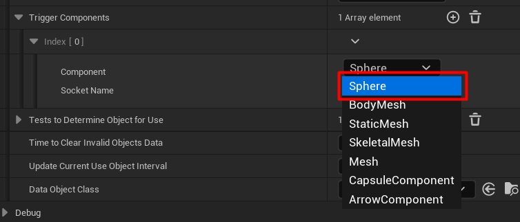 TriggerComponents - Triggers responsible for overlaps with interactive objects. You are unlikely to need more than one. Choose the component previously added to your actor (Sphere) here.