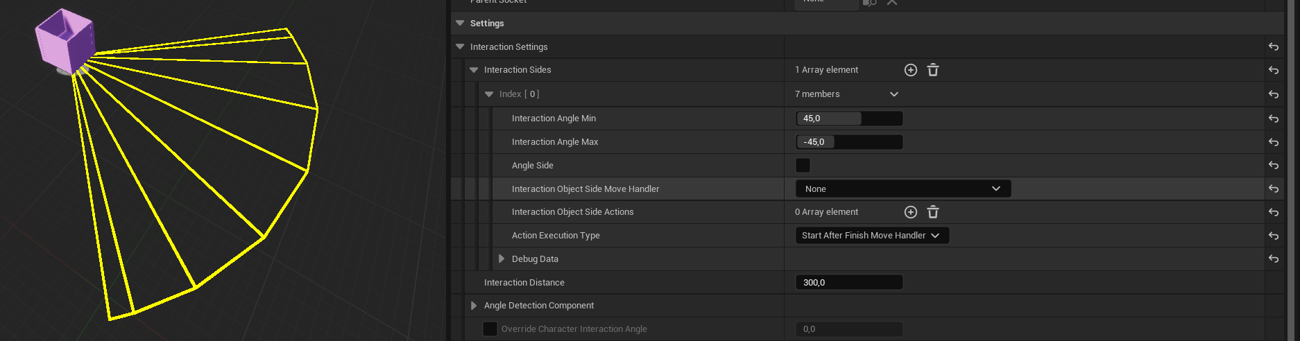 AngleDetectionComponent: The component by which the angle between the character and the object will be determined; choose one of the available ones in the actor.