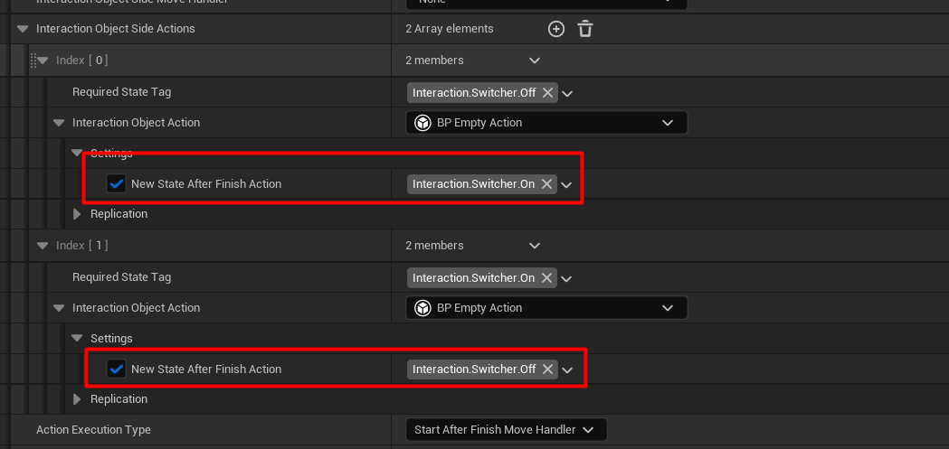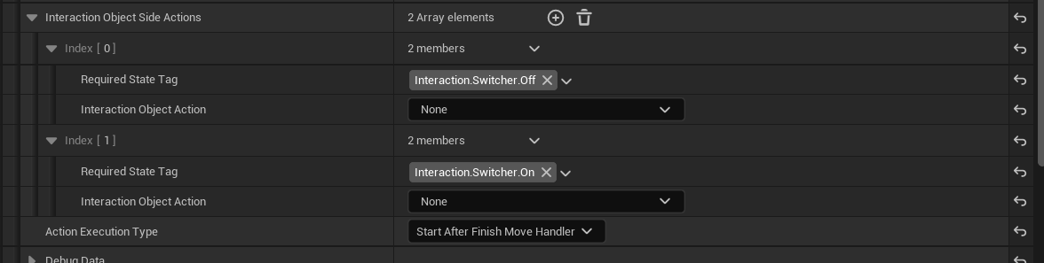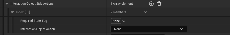 Let's start by clarifying that the actions for interacting with an object are selected based on the current state of the object. For example, if the current state of the door is "closed," the available action for it would be to open the door. In the case of simple interactions without changing the state of the object, these settings can be neglected. The states of the object are described in the form of FGameplayTag.